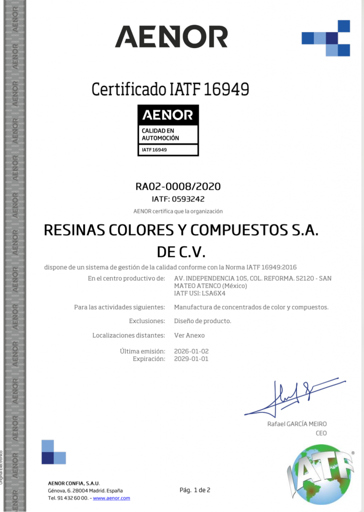 Cumplimos con estándares internacionales CERTIFICACIONES Certificado ISO 9001 Ver más Certificado IATF 16949 Ver más Laboratorios acreditados ISO 17025 Ver más En proceso de implementación ISO 14001 Productos Resinas de IngenieríaColoresCompuestosRecuperación de MaterialesPurga y Aditivos Servicios Asesoría TécnicaCursos y CapacitacionesDesarrollo de Productos Servicios Teléfono 01 (722) 2169364 Email ventas@rccmex.com.mx Ubicación Haz clic aquí Suscríbete Recibe nuestro boletín Facebook